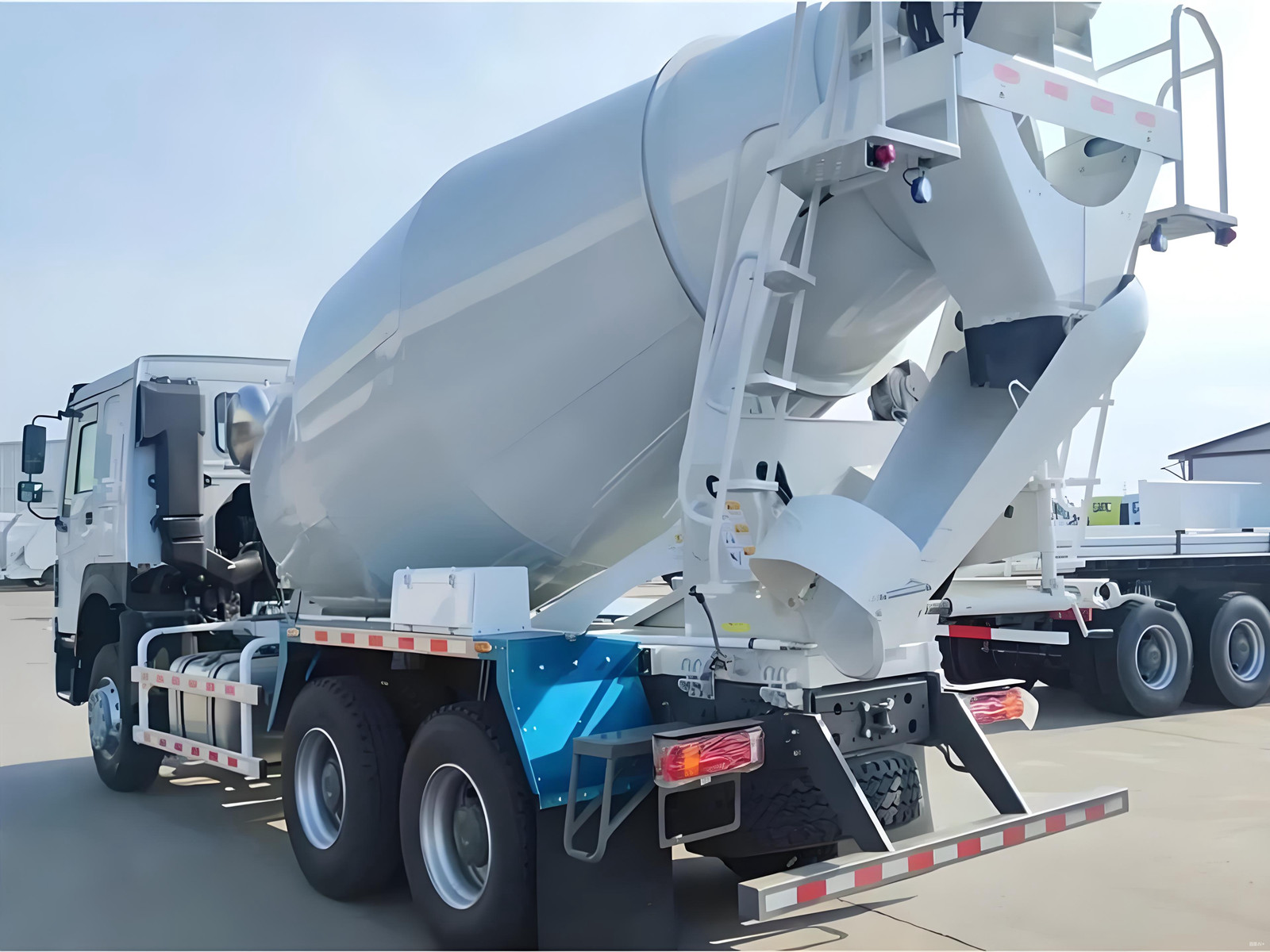 A synchronized Danfoss hydraulic pump and motor, paired with a PMP torque-boosting reducer, enables seamless drum rotation (2–14 rpm), achieving ≥4 m³/min loading and ≥3 m³/min discharge rates. The chassis design prioritizes stability, with a 14.5° drum tilt and pear-shaped drum profile lowering the center of gravity for safer transit on slopes. Complementing this is an air-pressure-controlled 350L water system, enabling precise moisture calibration during mixing and thorough drum cleaning post-operation. From highway bridges to urban high-rises, this truck balances raw power with operational finesse.